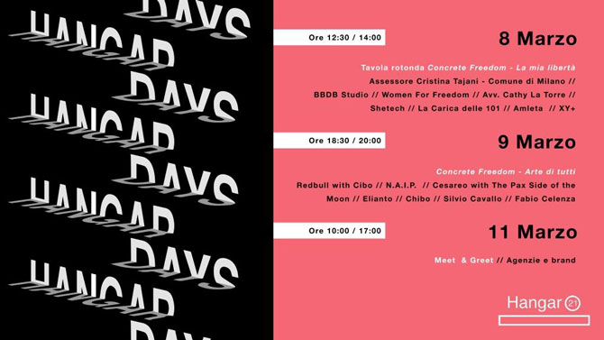 L’8 marzo, Giornata Internazionale della Donna, apriranno la kermesse degli Hangar Days gli interventi dell’Assessora Cristina Tajani e delle rappresentanti delle principali associazioni italiane che si battono per la parità di genere; seguiranno il 9 marzo le performance di N.A.I.P., finalista di X-Factor 2020, Cesareo, chitarrista degli Elio e le Storie Tese, Cibo, street artist, e quattro comici di Zelig. L’11 marzo la chiusura con appuntamenti e visite su prenotazione. E per la prima volta in Italia verrà registrato su blockchain il risultato del test sierologico effettuato a tutti i presenti.